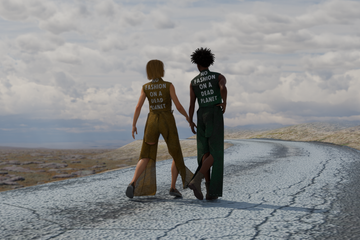 Informatie over banner: The Compostable Collection (phygital) van Laura Freya Weller, AMFI graduate, ondersteunt eco-activisten met kleding die voldoet aan hun behoeften zoals bewegingsvrijheid en bescherming. De collectie toont aan dat de mode-industrie moet overstappen van fossiele synthetische stoffen naar duurzame alternatieven zoals algen, wol, hennep en linnen.