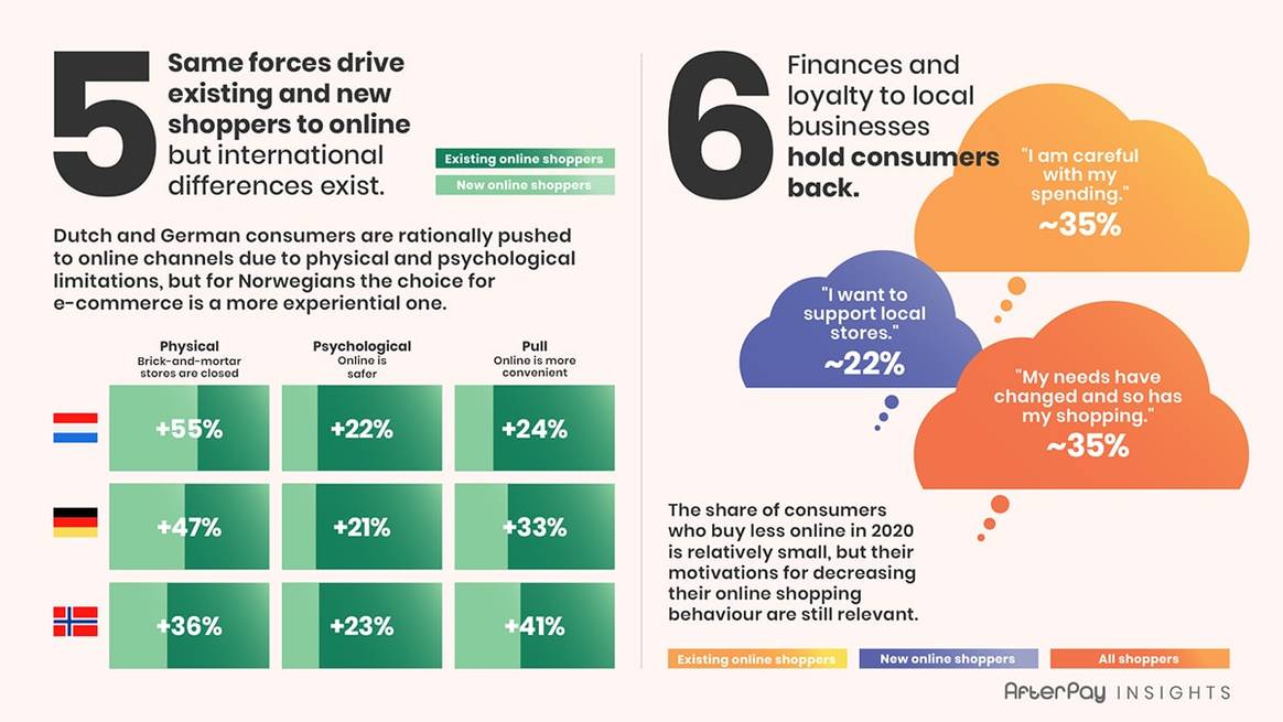 2020 was een jaar zonder weerga voor e-commerce. De groei ging door het dak toen consumenten - vaak uit pure noodzaak – meer via onlinekanalen gingen kopen. Om de impact van consumentengedrag op e-commerce te achterhalen, bevroeg AfterPay Insights (het e-commerce inzichtenplatform van betaalmethode AfterPay - Arvato Financial Solutions) in de loop van 2020 meer dan 66.000 Nederlandse, Duitse en Noorse consumenten over hun gedrag en attitudes ten opzichte van online shoppen. Nu 2020 achter de rug is, blikt AfterPay terug op dit uitzonderlijke e-commerce jaar en presenteert in deze ‘Top 6’ de belangrijkste bevindingen.