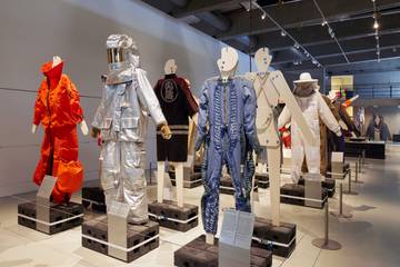 Bij binnenkomst wordt men direct meegenomen in de wereld van beroepen waar bescherming voor nodig is. Een zilveren astronautenpak, klompen en een slagersschort gemaakt uit honderden metalen deeltjes worden getoond en stelen de aandacht. Naast het feit dat dit geen hedendaagse klederdracht is voor de meeste van ons, valt de kwaliteit van de creaties op. Werkkleding is namelijk oersterk. Het is niet voor niets dat modemerken hier inspiratie uit halen. Neem bijvoorbeeld het Nederlandse bekende modemerk G-Star Raw, dat een heel archief aan werkkleding heeft opgebouwd. Met hardcore denim probeert het modemerk alle mogelijkheden van denim te verkennen. Dat uit zich in onder meer een denimpak voor hondentrainers met vulling en een pilotenpak uit 1942.