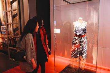 Verderop is een ander mooi voorbeeld te zien van de globalisering van Japanse iconen: een jurk voorzien van een golfpatroon dat onmiskenbaar refereert aan de wereldberoemde Japanse prent ‘De grote golf bij Kanagawa’ van Katsushika Hokusai. Maar hoe Japans de jurk ook lijkt, hij is ontworpen door Alena Akhmadullina, een Russische ontwerpster van luxueuze damesmode. Het museum heeft hem dan weer in bruikleen van de New Yorkse blogger Tina Lee, die zichzelf in deze jurk fotografeerde voor haar blog over Asakusa, een wijk in Tokio. “Dit stuk toont aan dat de grote golf een beetje van iedereen is geworden”, concludeert Daan Kok. “Bijzonder is hoe het met zo’n omweg – via Rusland en New York – uiteindelijk weer in Japan terecht is gekomen.”