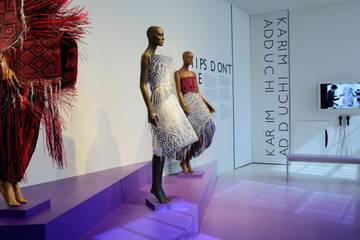 Bas Kosters, Marga Weimans, Karim Adduchi, Ninamounah, Art comes First en Patta tonen ieder drie outfits die een hedendaagse boodschap uitdragen. In de meeste gevallen gaat het om bestaand werk uit hun archief, soms nieuw werk, zoals bij Ninamounah. De Rietveld-alumna lanceerde anderhalf jaar geleden haar eigen label en studeerde eerder biologie. Ze wordt gedreven door een interesse in de natuurlijk aard van de mens. Wonderlijk genoeg is het vrouwelijk lichaam door de eeuwen heen in de meest onnatuurlijke vormen geforceerd. Met hulpstukken als paniers, crinolines, onderrokken en korsetten werd het silhouet aangepast aan het op dat moment heersende vrouwbeeld. Er is zelfs een zwangerschapskorset te zien op de tentoonstelling –alles voor die felbegeerde wespentaille. Ninamounah versneed stereotype stukken als het maatpak, het uniform en het korset en voorzag ze van rondingen, zoals een zwangere buik en borsten, om juist de vrouwelijke vormen te vieren.