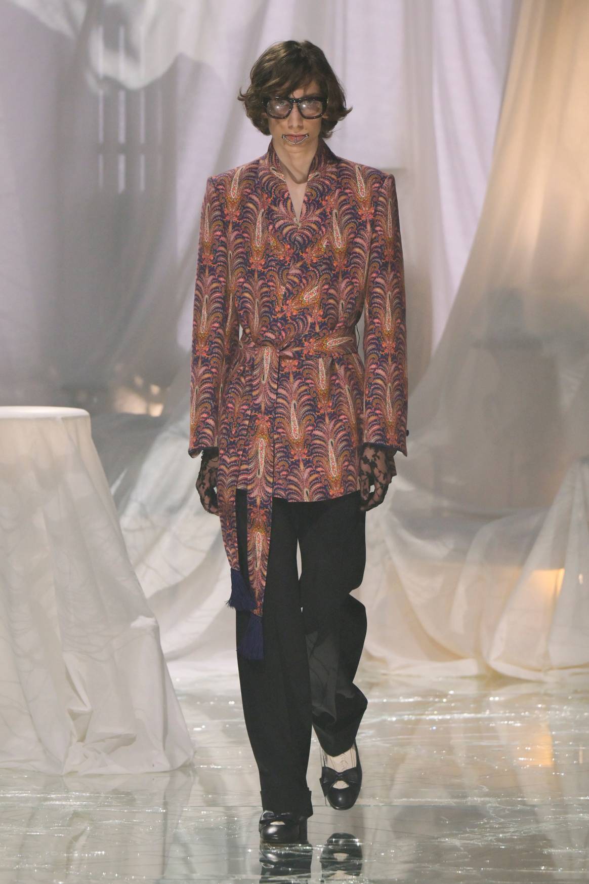 De Office Core-trend, een esthetiek geïnspireerd op het kantoorleven, is terug te vinden in de mannelijke looks die voorbij kwamen. Maar waar de touch van Alessandro Michele voelbaar is, is in de toevoeging van sieraden: een parelketting van wit parelmoer, (nep)piercings op de lippen of als oorbellen in een tribale stijl, kanten handschoenen of een rode kraag.
