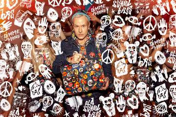 Bas Kosters heeft de tijd genomen om zijn twee prints voor OldSchool Bags te ontwikkelen. “Ik vond het leuk als het echt zou groeien, als een project.” Voor de zwartwitprint – ‘de dark side’ – liet hij zich leiden door symbolen die typerend zijn voor jeugdculturen, zoals anarchie- en peacetekens. “Ik bedenk me nu dat er eigenlijk ook een yin-yangsymbool tussen had moeten staan, dat was helemaal hot in mijn tijd.” Voor dit dessin is hij ‘uit zijn teken-comfortzone’ gekomen en laat hij een ander handschrift zien. De tweede print, geïnspireerd op het sparen van buttons, is kleurrijk en duidelijk herkenbaar als Bas Kosters. “Ik vind modeprints vaak zo gevoelloos. Daarom hebben we de buttons daadwerkelijk gemaakt en vervolgens gefotografeerd. De print is een combinatie van oude en nieuwe figuurtjes ontwikkeld door de Bas Kosters Studio om de geschiedenis van het merk te benadrukken. De denimachtergrond is ontstaan op basis van een oude jeans uit mijn archief. Die hebben we speciaal voor dit project met de hand geverfd in een kleur die we mooi vonden en daarna gefotografeerd. Al met al waren er dus behoorlijk wat handwerkstappen nodig om tot die digitale print te komen.”