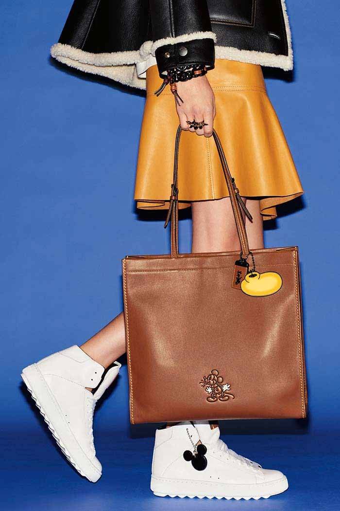 Speciaal voor de collectie heeft Coach de ‘Kisslock’ tas uit 1960 opnieuw uitgebracht, voorzien van een afdruk van Micky Mouse in het leer. Naast tassen zijn er ook sneakers in het assortiment opgenomen, voorzien van een handtag van Mickey’s oren. Het iconische silhouet van het Disney-figuur is tevens uitgevoerd in studs op een bikerjasje.