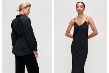 Het kleurenbeeld van de capsulecollectie is al net zo compact als de collectie zelf: zwart en offwhite. Neem bijvoorbeeld de blouse van gerecycled polyester die mooi soepel en vloeiend valt: draag je de blouse los, dan geeft dat een meer puur en ingetogen beeld. Doe je de brede ceintuur van dezelfde stof erom, dan creëer je juist een feestelijke outfit.