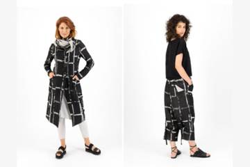Wat ontwerp je voor de vrouw die niet van standaard houdt? Daar weet ontwerpster Anne Habers wel raad mee. De eigenzinnigheid en originaliteit straalt van haar ontwerpen af. Neem bijvoorbeeld de reversible jas uit deze collectie, met het eigenwijze ruitdessin in zwart/beige, en omgekeerd in beige/zwart. Habers: “De jas combineert perfect met de bijpassende broek. Het leuke is dat je voor dezelfde kleurstelling kunt kiezen of juist voor de contra variant. Verder bevat de collectie ook weer enkele laagkruisbroeken. Deze keer heb ik bijvoorbeeld gekozen voor een stijlvol exemplaar in linnenkwaliteit, als onderdeel van een gestreept pak met lange blousejas. Het pak is er in beige met een fijne zwarte streep en in het zwart met een fijne beige streep.”