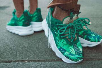 De special The Concepts x Versace Chain Reaction sneakers zijn alleen beschikbaar in de winkels van de Amerikaanse sneakerstore in Boston en New York. Voor een paar moet 1075 dollar worden neergelegd. De herkenbare groene jungle print van de jurk is te zien op de schoenen.