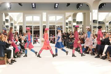 Hoe uitbundig Chanel’s decors meestal zijn, zo ingetogen was hij nu. Karl Lagerfeld creëerde een ‘couture salon’ setting met front row seats only . Op de catwalk: elegante schnitten, nette rokken tot onder de knie met zijsplitten, leren handschoenen en bolhoeden. Voor een najaarscollectie waren de outfits opvallend roze en lieflijk.