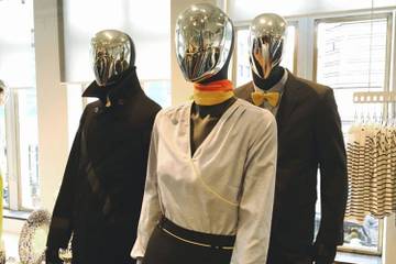 Galeries Lafayette en Patrizia Pepe haalden afgelopen maanden ook Changing Faces poppen in huis: het Parijse warenhuis koos voor beige maskers, het Italiaanse modemerk voor glanzende gouden.