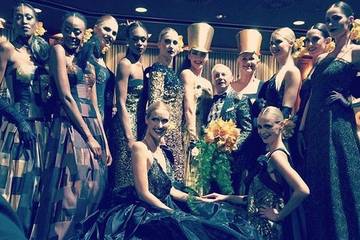 ”Ik ben langer dan een jaar bezig geweest met deze collectie”, aldus Kolk. “Het is absoluut een feestcollectie. Er zijn zelfs een paar stukken waarvan ik denk dat ze misschien nooit verkocht worden. Maar ze zaten al zo lang in mijn hoofd, ze moesten gewoon gemaakt worden.” Van mantelpakjes tot galajapons, het kwam allemaal over de catwalk voorbij. Maar liefst vijfenvijftig stuks, voornamelijk in de kleuren goud en zwart, met overal strikken als verwijzing naar het thema. “De jurken op zichzelf zijn natuurlijk al uniek, maar dat zijn de stoffen ook. Van sommigen is slechts twee meter geweven. Het is eigenlijk niet van deze tijd”, lacht de ontwerper.