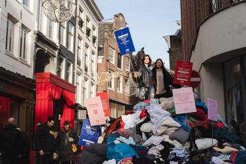 Nederland’s bekendste winkelstraat - de Kalverstraat in Amsterdam - is op vrijdag 20 december deels geblokkeerd tijdens een modeprotest. 6.000 kilo aan afgedankte kleding werd gedumpt in de winkelstraat. Het protest roept modebedrijven op om openheid te geven over productievolumes en vraagt beleidsmakrers om effectievere wetgeving.