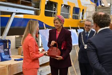 Koningin Máxima ontvangt circulaire handtas van Fraenck tijdens NS-bezoek