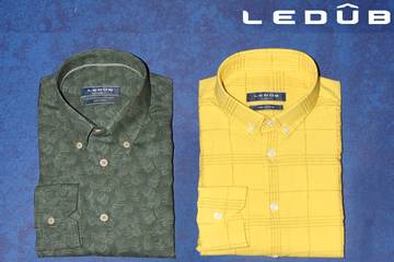 Naast dit frisse blauw thema is er de mogelijkheid om het eerste januari programma uit te breiden en te complimenteren met een felle geel. Met YELLOW SUNSHINE brengen we de donkerdere groen en navy blauwe kleuren samen met geel, waardoor direct een zomers geheel ontstaat. Ook hier zijn enkele bijzondere doeken te vinden, zoals een mooie tonale textuur ruit of kleine subtiele tropische print. Uiteraard in zowel een lange mouw die nonchalant en casual opgerold kan worden en een korte mouw. Ledûb is klaar voor een zinderende zomer.
