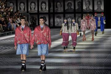 Toen de modellen naast elkaar liepen, hand in hand, was het idee dat mensen samen sterker zijn, voelbaar. De gebruikelijke Gucci kenmerken waren in de verschillende looks zichtbaar: de genderloze blouses met strikken, de caleidoscopische tweedelige sets (in bloemen, jacquard of in een felgekleurde sportkleding vibe; in luipaard, chinoiserie of simpelweg glinsterend) met gelaagde details, abstracte verwijzingen en een flinke dosis eclectische accessoires, zoals zonnebrillen met kettingen. Het geheel was een smeltkroes die teruggreep naar de jaren tachtig. Gremlins, de wezens uit Steven Spielbergs beruchte film uit 1984, maakten een comeback op tassen, borduursels en bovenop glijbanen.