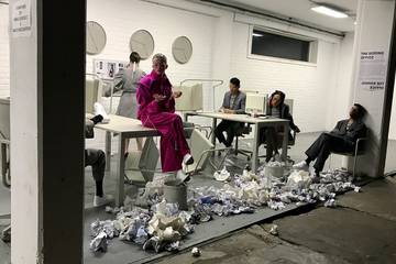 ‘The Boring Office’ was één van de vijf werkgerelateerde thema’s waarmee bezoekers werden ontvangen bij aanvang van de FW20-presentatie van het merk eind februari in Iso-Amsterdam, een oud en ongebruikt industrieel pand dat werd omgetoverd tot werkruimte waar af en toe evenementen worden georganiseerd.