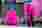 Een felroze jurk met een zwaar versierd bovenstuk en een meerlaagse rok over een zwarte broek.