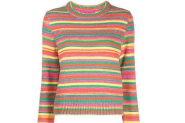 Bij Wolf & Badger heeft de 'Rita'-trui een regenboog over de borst en de armen; bij Kule is de 'Holly' er in een regenboogversie en The Elder Statesman toont een kasjmier trui met een horizontale streep.