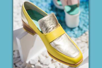 In de flyer zijn een aantal schoenmodellen te zien: lakleren veterschoenen met strikveters, sneakers met chunky zool en pastellen details, print sandalen met hak en colorblock instappers met lage hak.