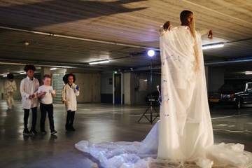 Het is zoeken naar een parkeerplaats voor de fashionshow van Yasmina Ajbilou. Even later blijkt waarom: de parkeergarage van het Open Space Contemporary Art Museum (Oscam) in Amsterdam is gereserveerd als showlocatie. Midden in de industriële ruimte staat een model in een witte jurk op een sokkel. Als de muziek begint verschijnen er twee kinderen, elk met een pot verf in de hand. Terwijl de modellen opkomen bekladden ze de witte stof met blauwe strepen. De performance doet denken aan de legendarische show van Alexander McQueen waarbij een model in een smetteloos witte outfit met verf werd besproeid door twee robotarmen.
