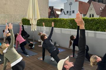 Giebel-Yoga in Münster op het dakterras van modehuis Schnitzler. Credits: Modehaus Schnitzler