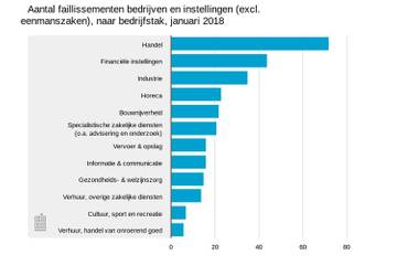 In november 2017 gingen er nog 249 bedrijven en instellingen op de fles, daar waar dit aantal in december en januari op 266 en 271 lag. Eenmanszaken zijn in de berekeningen niet meegenomen, aangezien deze in de regel worden opgeheven wanneer zij ophouden te bestaan, hetgeen niet wordt aangemerkt als faillissement.