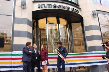 Twee minuten voor tien uur komt Jerry Storch, de Canadese CEO van Hudson’s Bay, symbolisch voor de entree op de Nederlandse markt, aangefietst. “Hij heeft wel even geoefend," zegt Janse. Storch wordt gevolgd door een groep ‘influencers’ als Robin Balou Huisman en rapper Dio, gestoken in de Limited collectie van Hudson’s Bay.