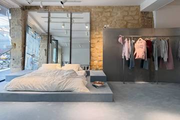 Voortbouwend op die succesvolle activatie van een jaar geleden keert Scuffers nu terug naar Parijs, zij het met enkele opvallende verschillen ten opzichte van 2025. Ten eerste de locatie: van de Rue Saint-Honoré naar de Rue de Turenne, waar het merk nu buren zijn van namen als Isabel Marant, American Vintage en Ami Paris. Dit zegt veel over het commerciële karakter van deze buurt, vol kunstgalerieën en intieme cafés. Ten tweede is de pop-up nu volledig toegankelijk op straatniveau, voor iedereen die langskomt. Ten derde gaat de sfeer een stap verder dan de eerdere 'Private Suite'. De ruimte ademt de intimiteit van een Parijse appartement, met een groot bed, een ontbijtbar en een badkamer die dienst doet als paskamer. Dit alles achter grote glazen puien met halfgeopende metalen lamellenjaloezieën, die het interieur van dit Scuffers-appartement in Parijs bewust slechts gedeeltelijk aan het zicht onttrekken.