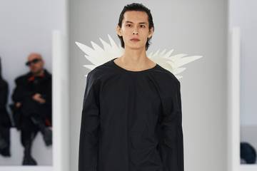 Waar Loewe-creatief directeur Jonathan Anderson voor SS23 womenswear nog volledig voor een surrealistische twist ging, was het tijdens de FW23-show voor mannen wat meer ingetogen. De liefde voor een witte showruimte, met daarin enkele opvallende elementen keerde wel terug.