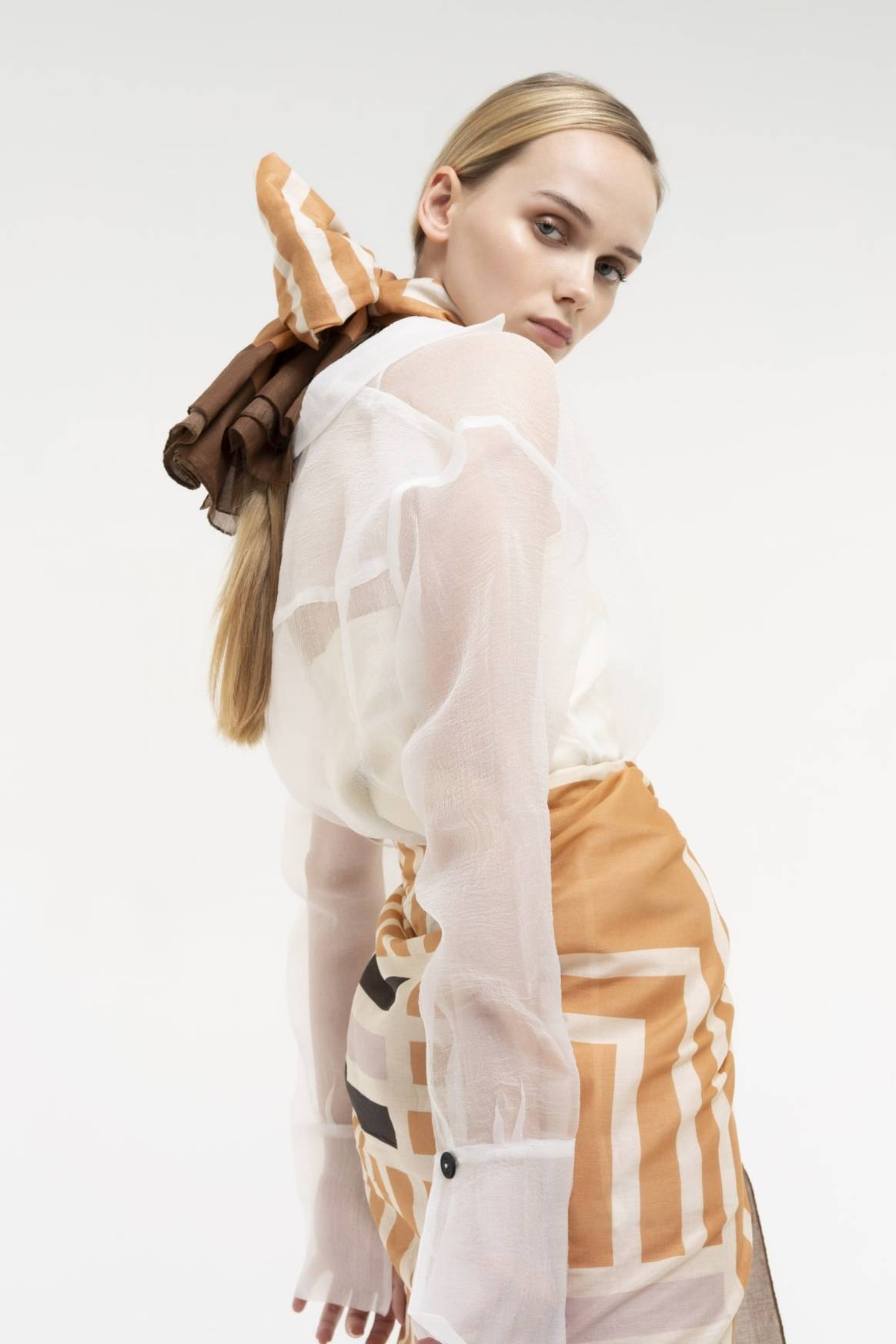 Haar modernistisch-geïnspireerde foulards in Italiaanse zijde en katoen, geproduceerd met een hoge graad van savoir-faire in een Frans atelier, kan je naargelang de grootte inzetten als zomerkleedje, topje, sluier of als sieraccent om de hals of de pols. Ook al kan je ze kameleongewijs stylen op verschillende manieren, de luxueuze grand chic die ze uitstralen is een constante.