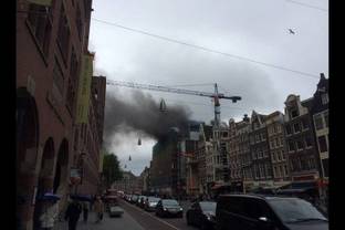 In een pand op het Damrak, tegenover de Bijenkorf, is een brand uitgebroken. Het gaat om het gebouw op Beurspassage 1, waar de nieuwe vestigingen van C&A en Primark in komen. Het gebouw staat nog in de steigers. Boven het Damrak hangen grote rookwolken, die uit de bovenste verdieping van het dak komen. Het Damrak is in beide richtingen...
