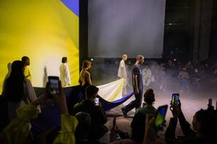 In het licht van de oorlog in Oekraïne lijken mode en modeweken onbelangrijk, zo niet frivool. En toch slaagt de Oekraïense ontwerper Jean Gritsfeldt erin het statement van het uur te maken met zijn modeshow in het Berlijnse Kraftwerk, die veel toeschouwers recht in het hart raakte. Het gaat niet om de mode Een model in een los zwart T-shirt met...