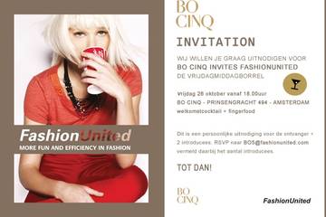 jammer, want daarmee blijven veel interessante contacten onbenut. De BoCinq invites FashionUnited Borrel gaat daar verandering in brengen. In een ongedwongen sfeer op een fashionable locatie kun je genieten van een heerlijk drankje, lekkere hapjes en tevens nieuwe contacten opdoen of bijpraten met bekenden.Voor meer informatie over de locatie: bo5.nl