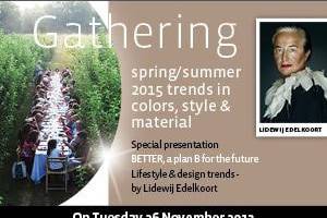 Een ongekend inspirerende presentatie over de kleuren, trends en styles voor het zomereizoen 2015 door Lidewij Edelkoort. De presentatie getiteld ‘Gathering’ is een visueel spektakel, waarbij beelden van sfeer, kleur en vorm elkaar snel opvolgen en wordt gevolgd door een uitgebreide toelichting door Lidewij Edelkoort.