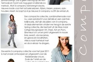 De eerste Sí company collectie voor het jaar 2011 is met smaak ontworpen en uitgewerkt voor de Nederlandse vrouw. Zoals de T-shirts en de vestjes die heel bijzonder zijn door mooie details aan de halslijn of een combinatie van print met uni. En de originele blazers in sweat. De vrouwelijke styling en goed te mixen kleuren en dessins maken van Spring I van Sí company mooie en makkelijke mode, helemaal van nu.