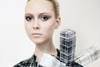 “Mijn uitgangspunt was het klassieke tweedpakje van Chanel. Het ziet er op het eerste gezicht stijf, truttig en ouderwets uit, maar toen ik een pakje in de winkel van dichtbij zag, kwam ik erachter dat er eigenlijk heel veel in gebeurt. Er worden verschillende soorten garens gebruikt in één stof, waardoor het er rijk en luxueus uit ziet. Met restpartijen garens ben ik mijn eigen stoffen gaan weven. Ik houd ervan om de technische aspecten eigen te maken en door te ontwikkelen. Daardoor heb ik een weeftechniek ontwikkeld die het mogelijk maakt om naadloos in de vorm van het ontwerp te weven. De 3D-blokken die een terugkerend element in de collectie zijn, zijn geïnspireerd op de enorme 3D-kunstwerken van Rachel Whitebread en Anish Kapoor.”