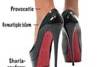 Foto rechts: Anke Vandermeersch, politica van Vlaams Belang, mag geen Louboutins meer dragen op de anti-islam poster