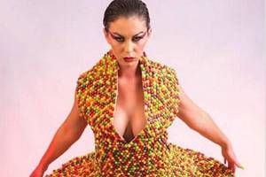 De Marylin Monroe achtige jurk met diep uitgesneden hals, is bedekt met een regenboog aan Skittles. Groene, gele, paarse, rode en oranje bolletjes vormen samen een kleurrijk geheel. De jurk vereist niet alleen vakmanschap en geduld – Bryan deed maar liefst 180 uur over de vervaardiging - maar ook zelfbeheersing, want wie zou er niet in de verleiding komen om het snoep op te eten?