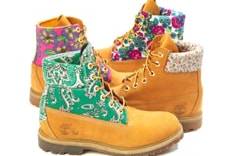 Vrouwelijke stofjes sieren de kraag, een pand of een compleet bovenstuk van de Timberlands, zoals de gele laarzen ook wel in de volksmond worden genoemd. De gereyclede stoffen zijn afkomstig van Textile Recycling for Aid and International Development (Triad), een Britse liefdadigheidsinstelling die kleding inzamelt en met de opbrengst ervan milieuvriendelijke projecten steunt.