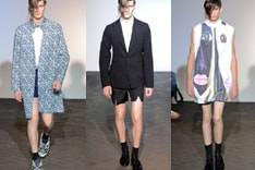Simons stuurde de modellen met lange, asymmetrische pony’s veelal de catwalk op in voor de ontwerper typerende kostuums, bestaande uit jasjes met 2-knoopssluiting en shorts tot boven de knie. Naarmate de show vorderde toonde de Belg meer kleur en meisjesachtige jongensmode zoals een roze bomberjack, en een lange tuniek met daaronder zo’n korte broek dat het ontwerp aandoet als jurk. Dessins evolueerde van een bloemenprintkraagje tot vrolijke jassen met all over print.