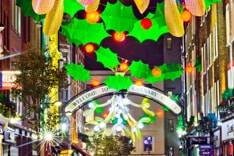 In between the mistletoe chandeliers and throughout the rest of the 12 streets of Carnaby, 25 oversized holographic holly leaf chains with glowing red berries are suspended above the streets in zig-zag formations, creating a spectacular display throughout the day and night.