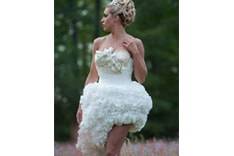 Mimoza Haska won dit jaar de Amerikaanse prijs. Met haar ontwerp tot kniehoogte geeft het niet als de bruid moet snotteren tijdens de emotionele momenten van de trouwerij. Haska - een kapster uit South Carolina - gebruikte 16 rollen wcpapier van het merk Charmin voor haar jurk. Het ontwerp was geïnspireerd op zwanen.